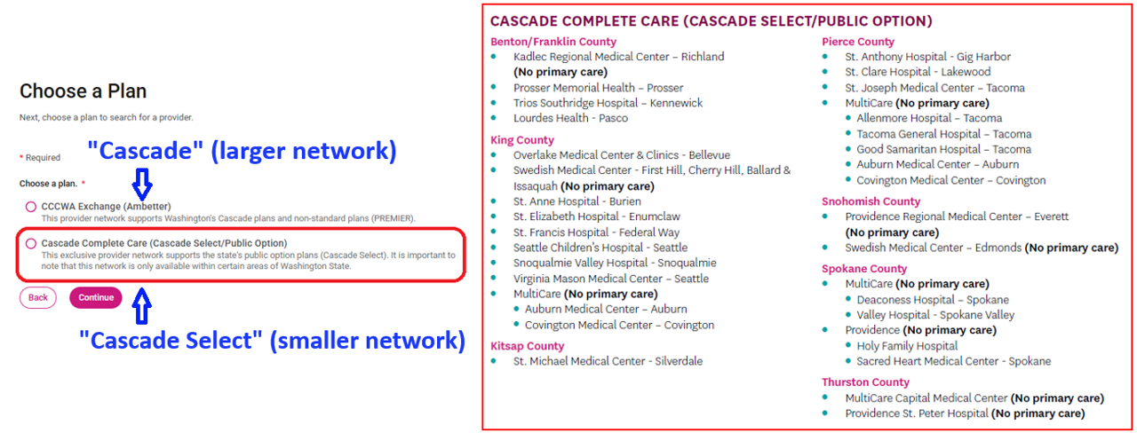 Do NOT use the WA HealthPlanFinder for searching for doctors, as their search function is not accurate. It’s always best to go directly to the carrier website and/or call your doctors office/hospital system billing department directly to confirm coverage. In the Hospital Chart above that is a general overview and there are many more hospitals covered. These are the main ones in the greater Seattle area. Check the Find a Provider link above for more details.