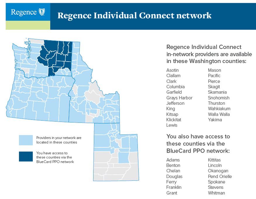 FIND A DOCTOR (CLICK HERE): “Individual Connect“ is individual network to look up providers. Regence has IN-NETWORK coverage in Washington, Oregon, Idaho, and Utah. They are unique in that they have Urgent Care covered in all 50 states (use the BlueCard PPO Network for Urgent Care Centers across the USA). As usual they cover an urgent medical emergency ER visit In-Network like all carriers.